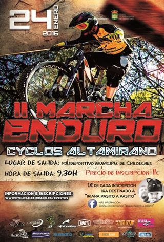 El próximo domingo 24 de enero de 2016, nuestra tienda organiza la II marcha Enduro "Cyclos Altamirano", en colaboración con el Excmo. Ayuntamiento de Chiloeches y el club mtb "La Toliga" de dicha localidad.La ruta tendrá salida a las 9,30 horas del polideportivo municipal de Chiloeches para cubrir 25 kms por los senderos de la zona, que cuenta con todo lo necesario para hacer disfrutar a los participantes con las bajadas más divertidas, encontrando en algunas de ellas diferentes zonas técnicas e incluso obstáculos artificiales (pasarelas, cortados, saltos,...).El recorrido estará guiado y marcado por los componentes del equipo BKBN-Cyclos Altamirano y Club mtb "La Toliga".
